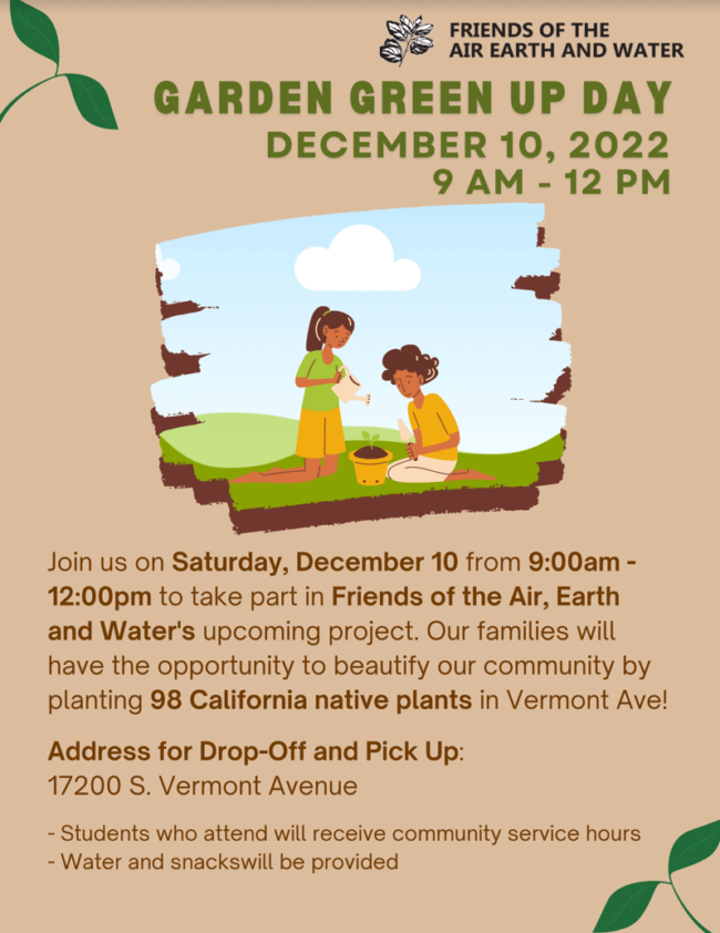 Join us on Saturday, December 10 for our Garden Green Up Day in collaboration with Friends of the Air, Earth and Water. Our families will beautify our community by planting 98 California native plants in Vermont Ave! Address: 17200 S. Vermont Ave.