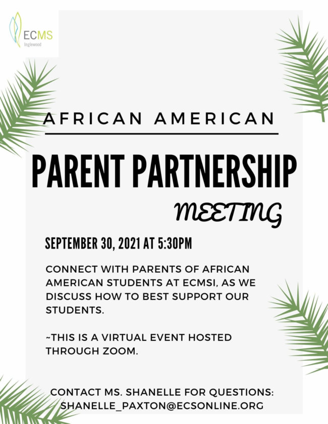 If you have an African American student, please plan to join us on Thursday, September 30th at 5:30pm, as we host our first African American Parent Partnership meeting of the school year. Click here to join.