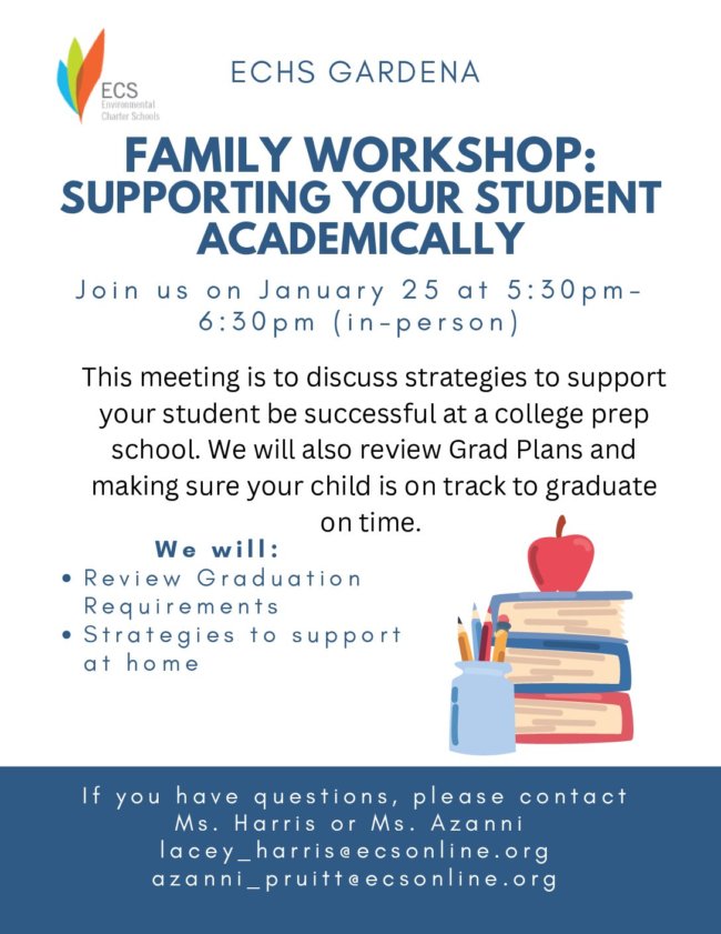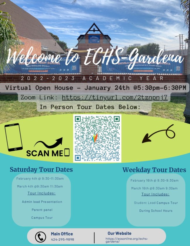 DetailsAre you or someone you know interested in attending ECHS-Gardena? Join us for a tour to learn more about our academics, meet our staff, and more! See the flyer below for more details. To sign up, click here.