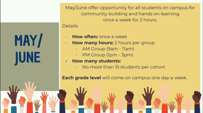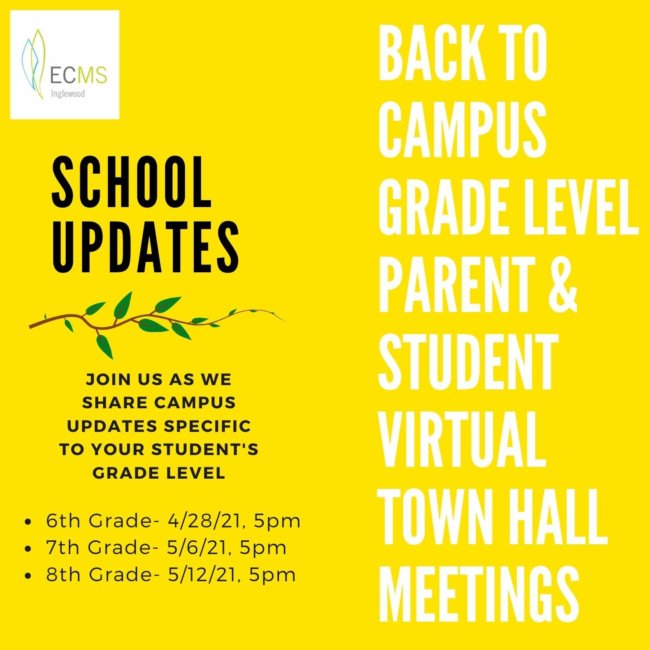 DetailsECMSI students will have the opportunity to safely visit campus for community building activities beginning in May. If you have not filled out the survey letting us know if you would like your student to participate, please click here to do so now. If you were unable to attend the virtual parent town hall meeting,…