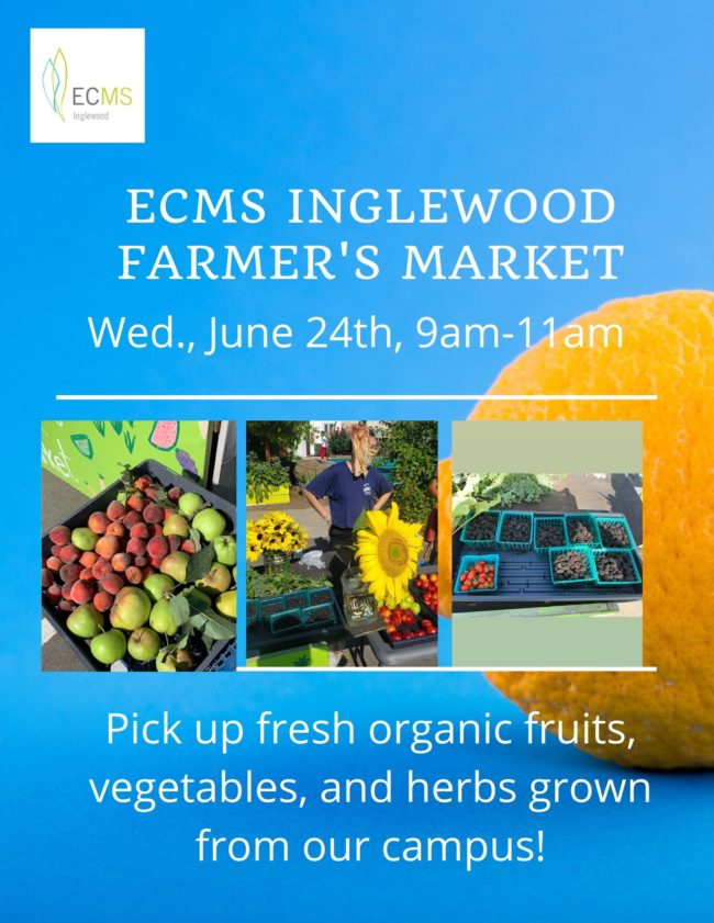 Dear ECS Inglewood Families, Drop by our campus Wednesday, June 24th, between 9:00am & 11:00am to pick up fresh produce while supplies last!