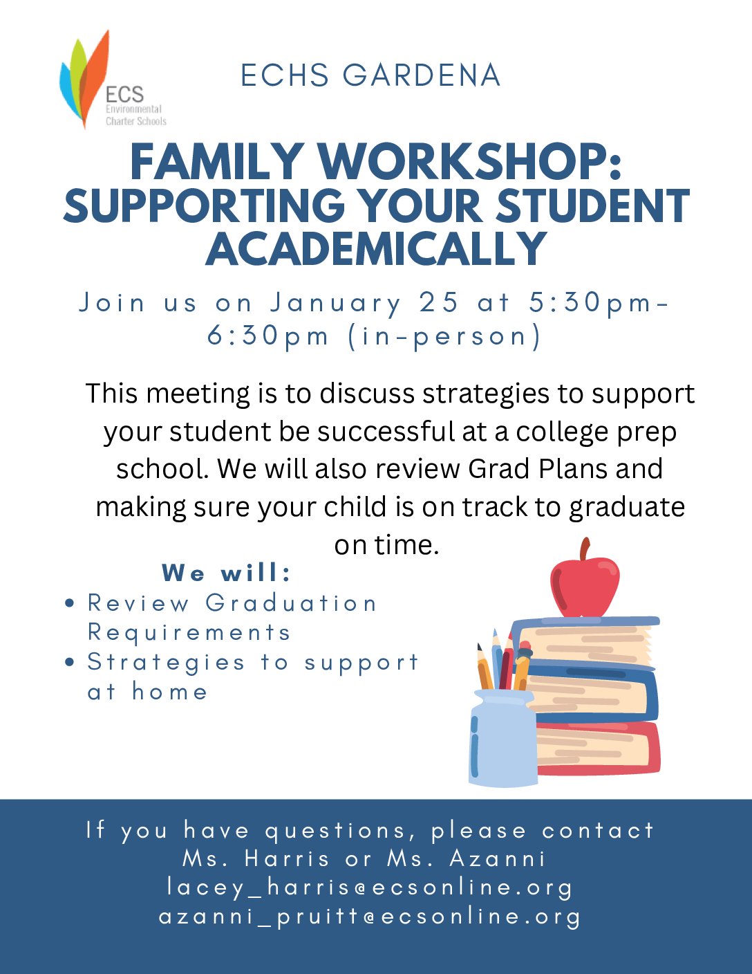 Jan182023ECHS – Gardena Join us on January 25 at 5:30pm-6:30pm (in-person) We will: Review Graduation Requirements Discuss strategies to support at home Powered By EmbedPress Category: ECHS – GardenaJanuary 18, 2023Post navigationPreviousPrevious post:23-24 Prospective Students Tour OpportunitiesNextNext post:Virtual School TourRelated PostsNo titleSeptember 3, 2025SUMMER SCHEDULEApril 29, 2025ECHS-GARDENA SUMMER DATESApril 29, 2025Family Resource Fair – February 20thFebruary 11, 2025Coffee with Administration – February 27thFebruary 11, 2025Green Day – February 22ndFebruary 11, 2025
