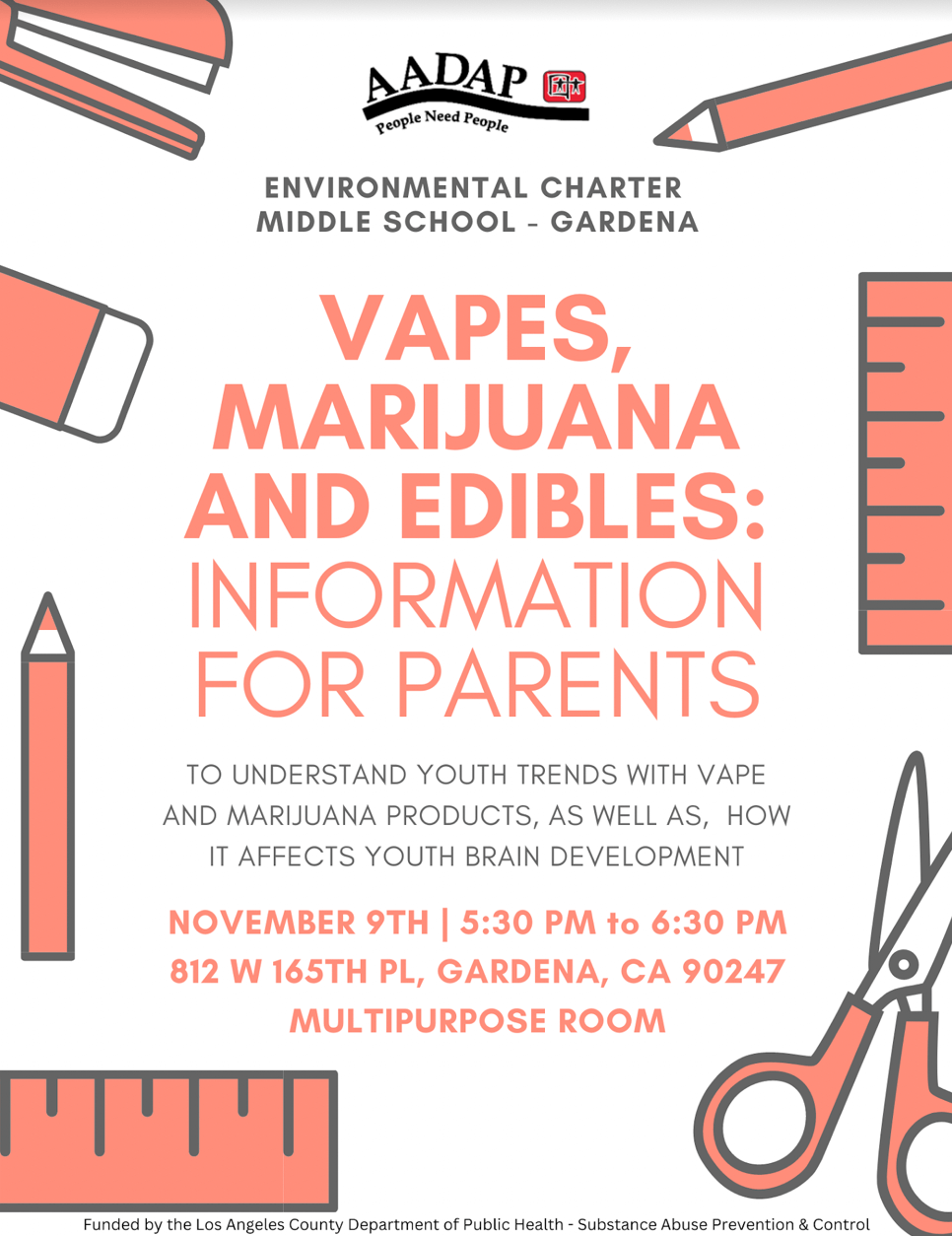 SAVE THE DATE! Join us for our fourth workshop in collaboration with our community partners, Asian American Drug AbuseProgram (AADAP). In this workshop, representatives from AADAP will discuss Vapes, Marijuana, and Edibles so our community can get informed on current trends and how these drugs affect youth brain development. Although this workshop is for parents, we encourage students to attend as well.